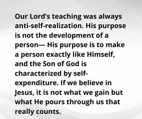 “He who believes in Me…out of his heart will flow rivers of living water”— and hundreds of other lives will be continually refreshed. Now is the time for us to break “the flask” of our lives, to stop seeking our own satisfaction, and to pour out our lives before Him. Our Lord is asking who of us will do it for Him? Oswald Chambers