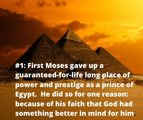 “Third, Moses turned his back on material wealth. He turned away from living high on the treasures of Egypt. . .As a prince of Egypt, Moses no doubt enjoyed his wealth. Yet he exchanged riches for poverty. Why? God’s call on his life required it. And Moses was “looking forward to the reward” of finding meaning and joy and friendship with God by telling His story, following God’s script for his life. ”