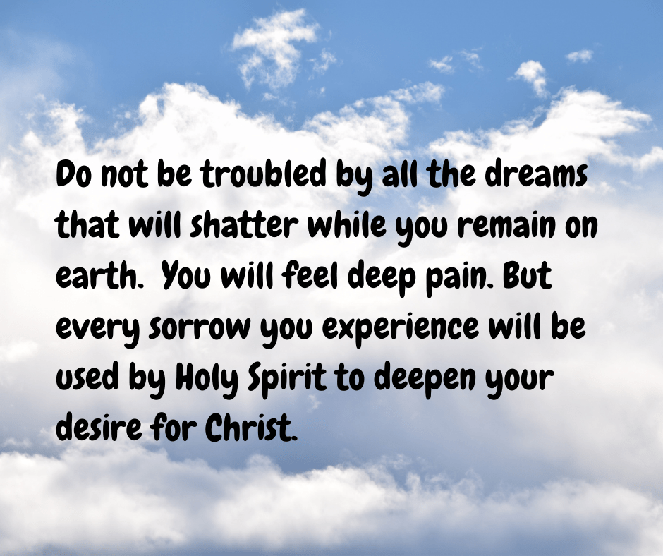God allows broken dreams and difficulties so that we will abandon ourselves! While this seems harsh, it’s actually His mercy that allows us to suffer and question things so that we will (in our discontent) look up from this life and world to Him! Followers of Christ are reborn into a new nature and spirit that hungers for God more than all else.