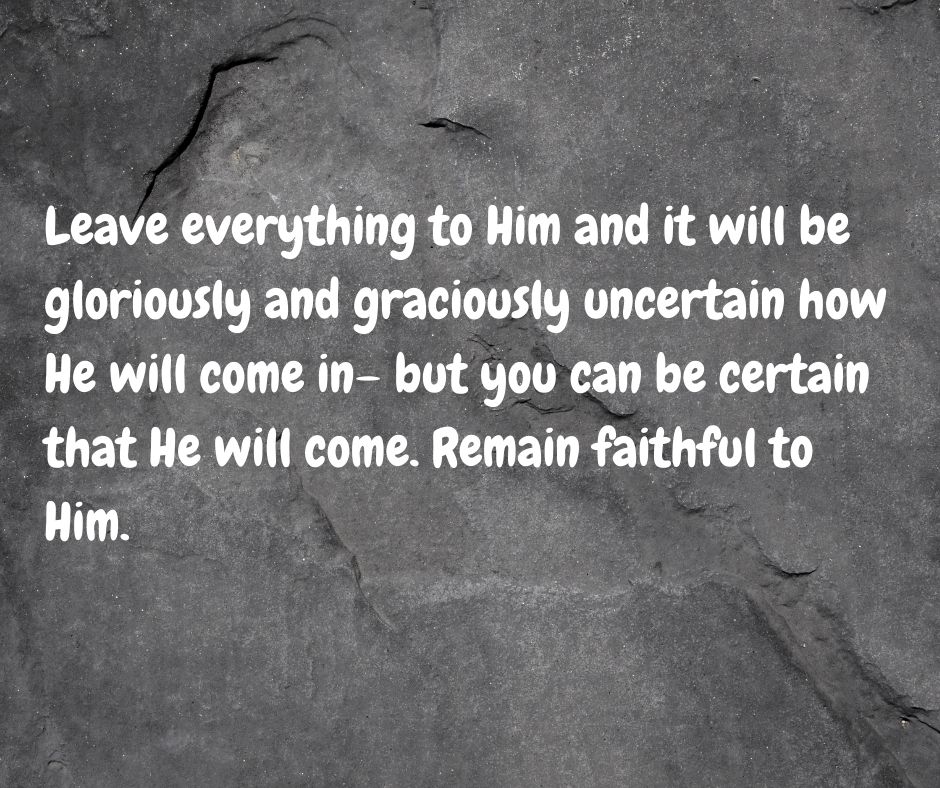 The concluding quote reminds us that when leaving things to Christ we can be certain that He will come! We don’t know for certain how, when, or where, but we can rest in faith! We serve a Risen, Resurrected Savior who is working to bring all of history to a close! We have the honor of showing others His love, grace, mercy, and kindness! God isn’t finished with you if you trust and walk with Him! He is working to redeem the lost around us!