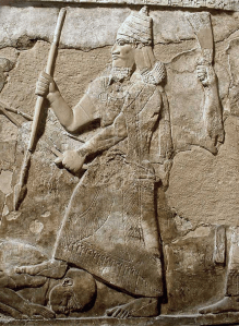 Tiglath-pileser III (Assyria)stands over an enemy, bas-relief from the Central Palace at Nimrud.