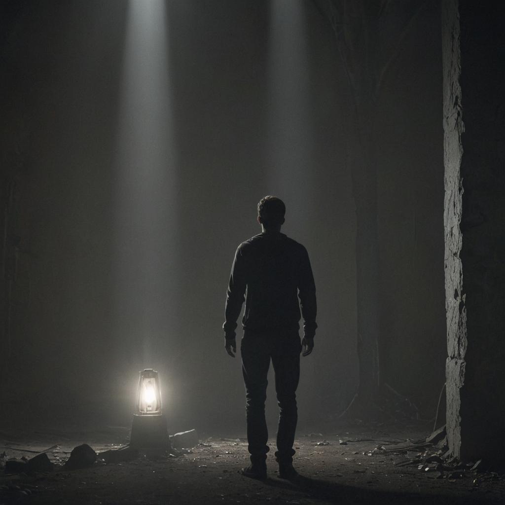 Difficulties in life leads a man to his knees in prayer before God. The light represents God’s presence.