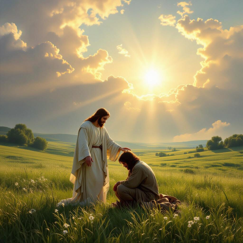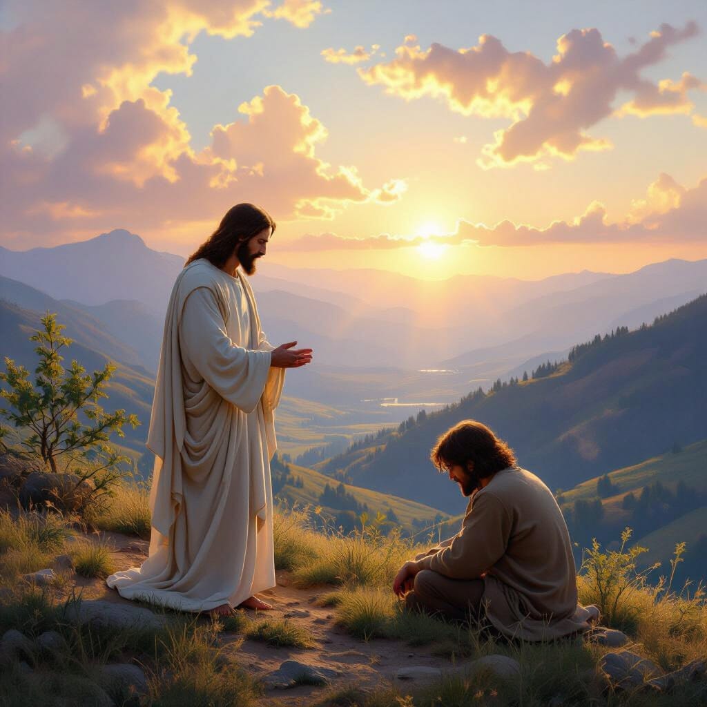 A.I. concept of Jesus waiting to greet the tired pilgrim on a mountain side.