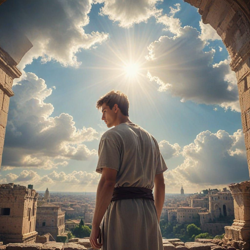 The young man chooses to follow Christ’s light as he realizes the temporal and fleeting nature of the world.