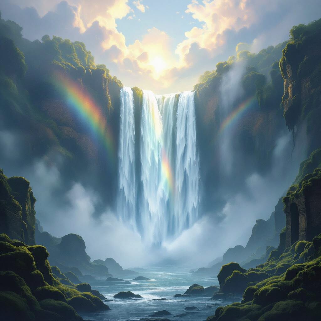 A.I. image of waterfall. With the raging waters comes a rainbow: a sign of promise in Genesis after the flood. When the raging waters of chaos come upon us, we can remember the promise of the rainbow.