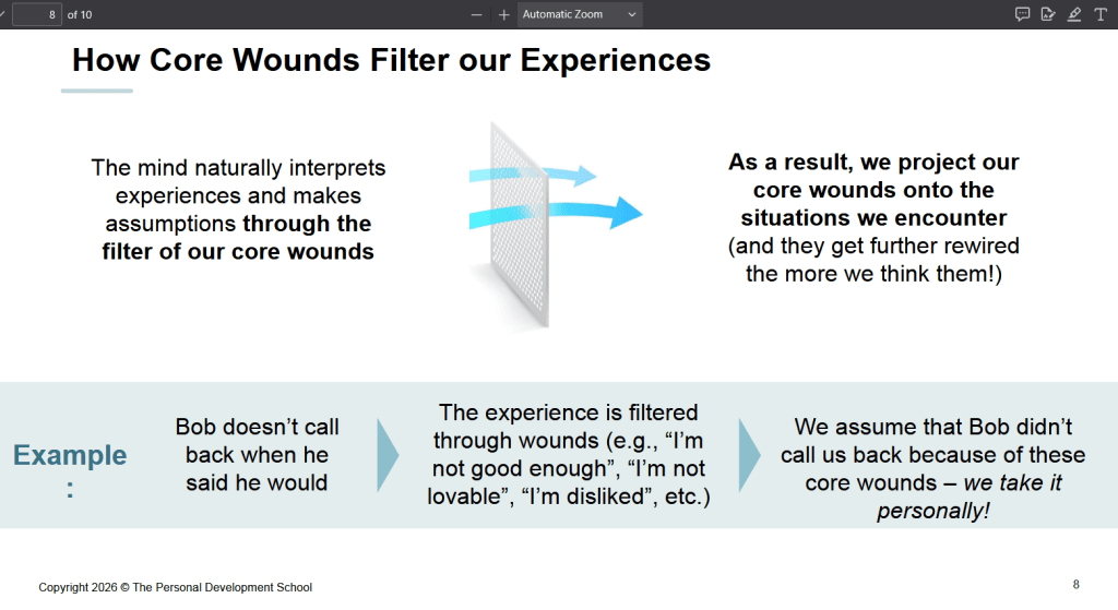 We all have a mental schema or “filter” through which we process our environment and interactions with others. Our core wounds causes us to filter experiences through these wounds and project the wounds onto the situations of daily life.