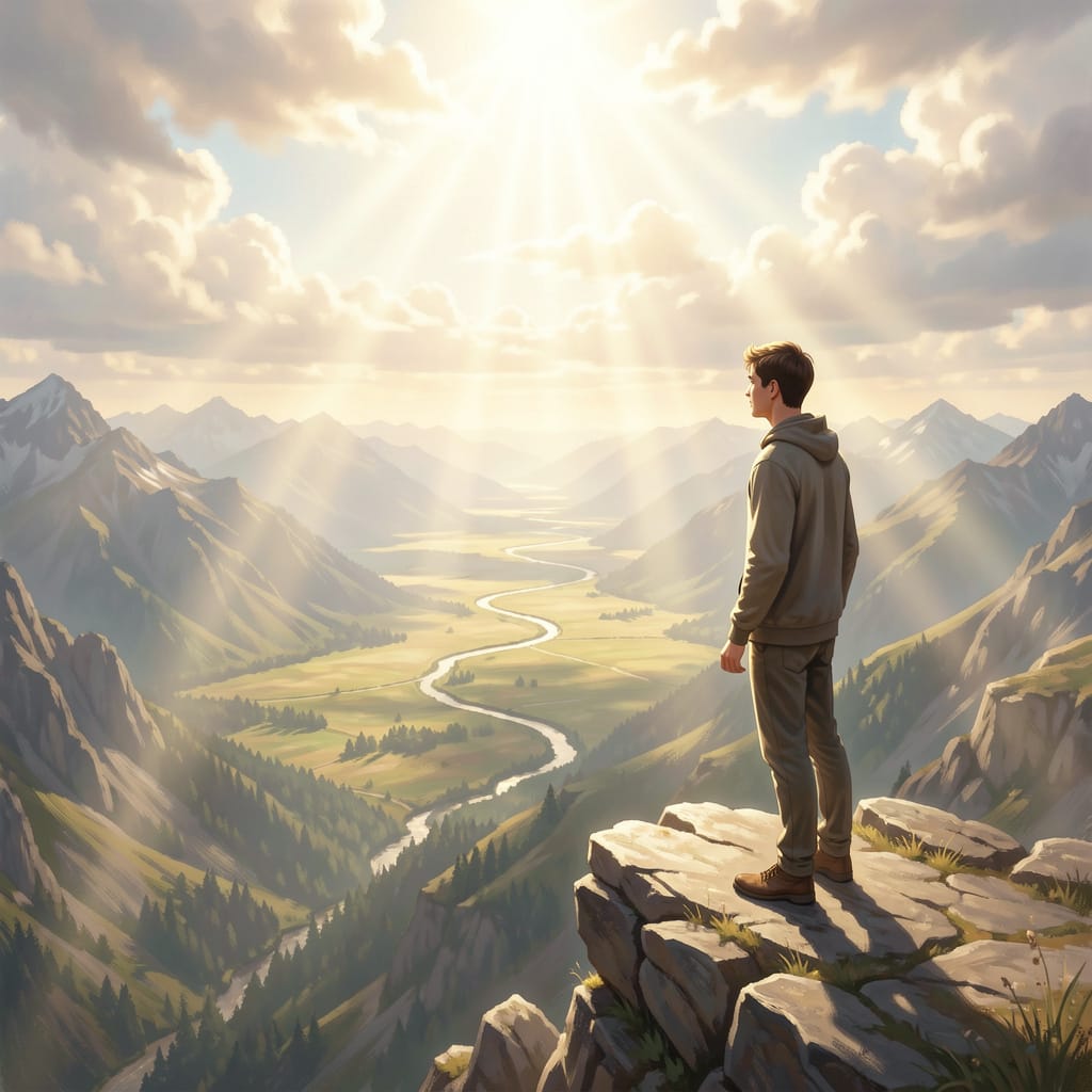 Brave, courageous pilgrim has endured and walked through the dark valley to ascend to a higher place. His Good Shepherd leads him to a different perspective as he reflects on his journey and anticipates entering the peaceful lush valley below.