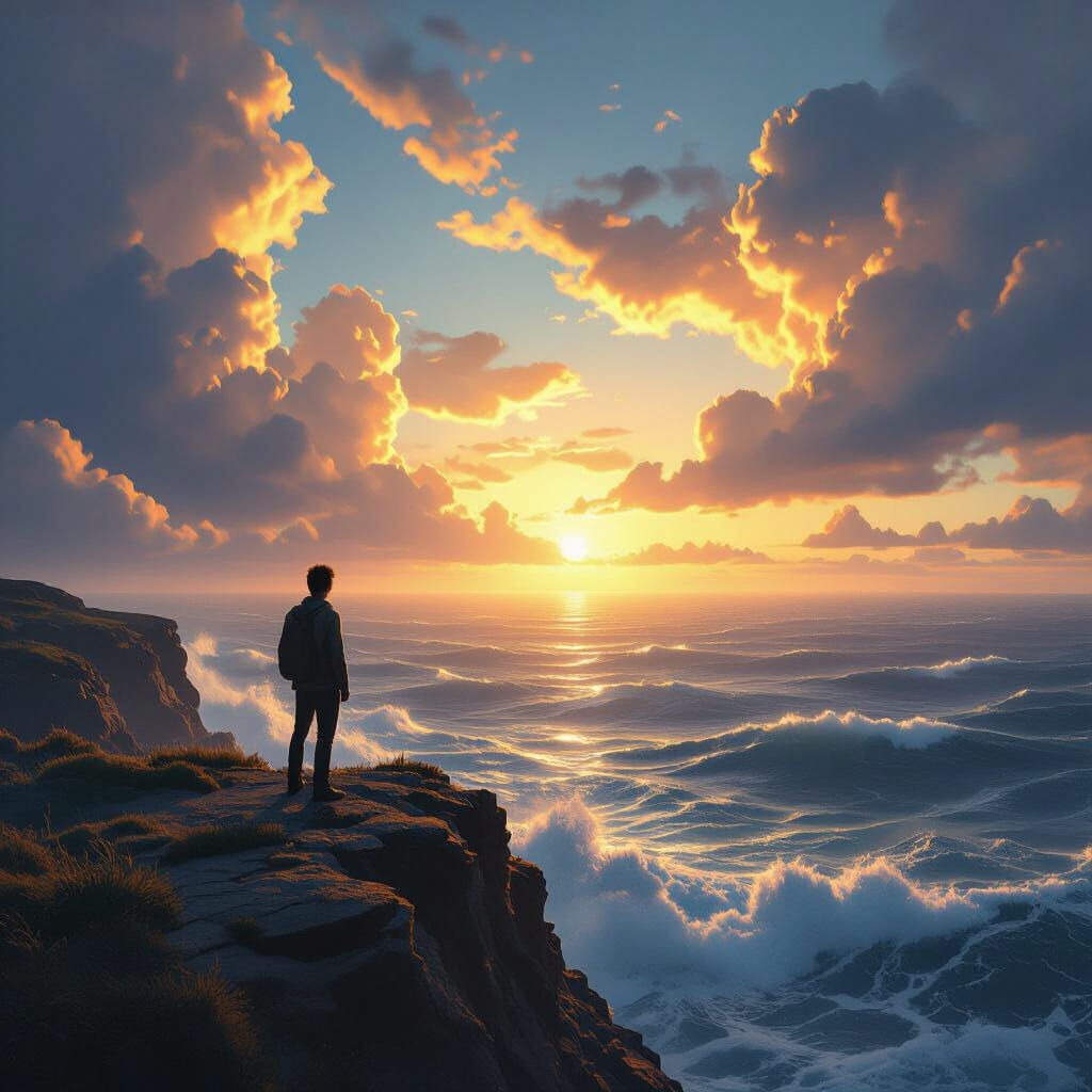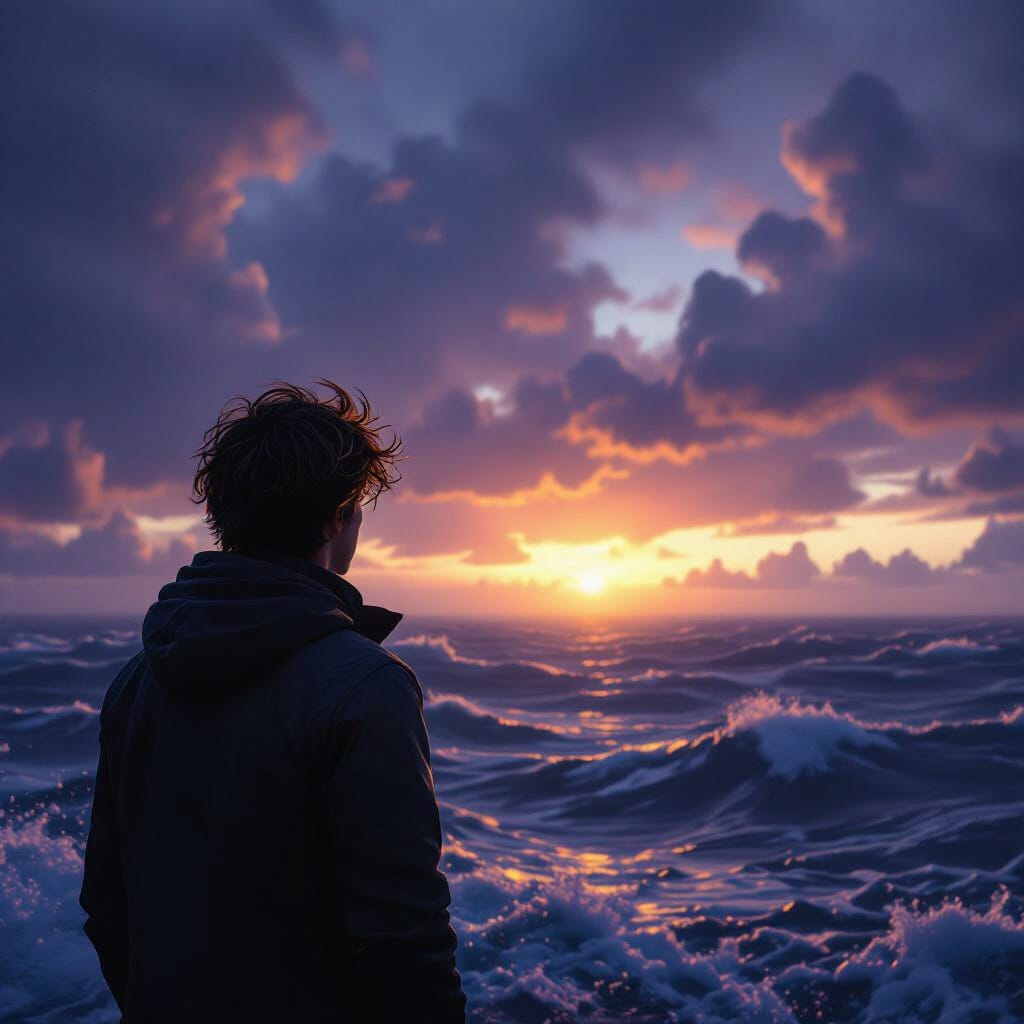 Featured Image: Pilgrim stands on beach as waves come crashing ashore from storm out at sea.